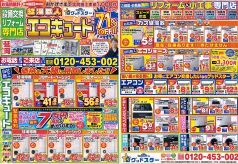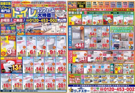 4月チラシ | イベント&お知らせ | 1Dayリフォームグッドスター お問い合わせ お問い合わせ 簡単お見積り 来店予約 LINE リフォームメニュー トイレ 給湯器 洗面化粧台 キッチン お風呂 ガスコンロ レンジフード すべて見る 施工事例 トイレ 給湯器 洗面化粧台 キッチン お風呂 ガスコンロ レンジフード すべて見る イベント&お知らせ 会社案内 会社案内 ショールーム 選ばれる理由 お役立ち情報 リフォームの流れ よくある質問 保証&サポート